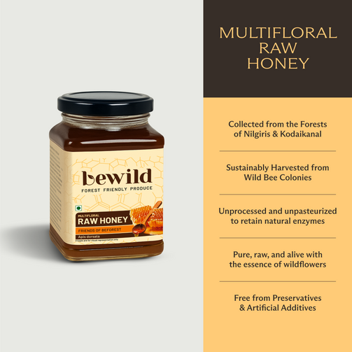 From the pristine forests of the Western Ghats - Nilgiris and Kodaikanal - comes Bewild Multifloral Raw Honey, gathered through our Friends of Beforest network. In these mist-clad landscapes where native flora thrives year-round, wild bees create a honey as complex and alive as the forest itself.